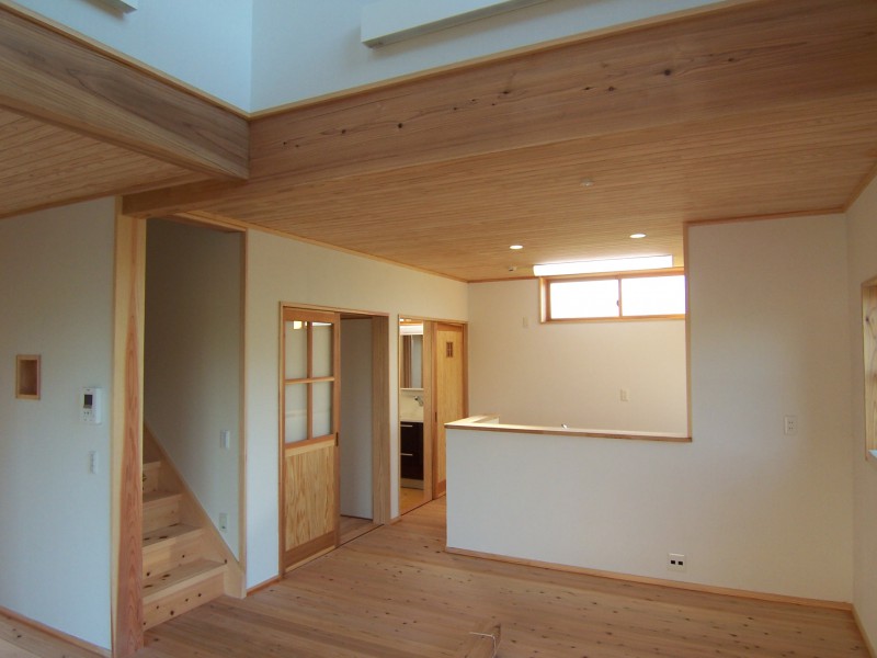 まずはリビングの吹き抜けです。「玄関を開けると、木のかおりが『ふわ~っ』ときて、部屋に入ったら力強い梁が見えて、吹抜けの高い天井には全面に本物の木が張ってあって、、、『まるで森林浴をしているみたいだ』と感じる家にしたいんですよ~」と仰ったイメージを形にしました。