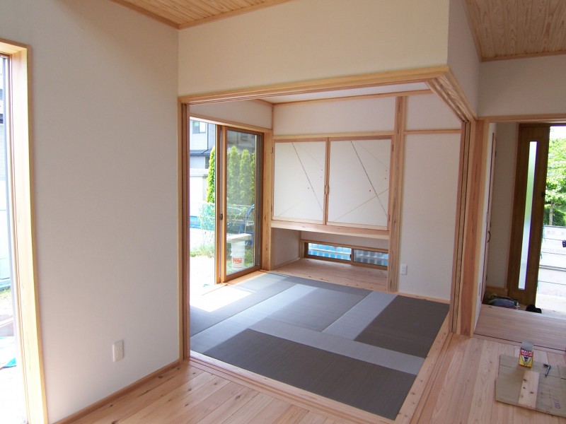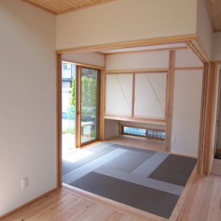 和室の写真です。こちらも「広がり」を持たせるために、リビングと一体的につくっています。通常設けることが多い角の柱も開放感を出すためにオープンにしています。畳は「おり座」の薄畳みです。安全性への配慮と共に、わんぱく盛りのお子さんが遊んでも耐久性が高いこと、そして実際に見た時のデザインをすごく気に入ったとのことでした。 壁と天井は土佐和紙で柔らかな雰囲気に仕上げています。
