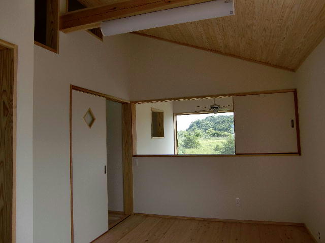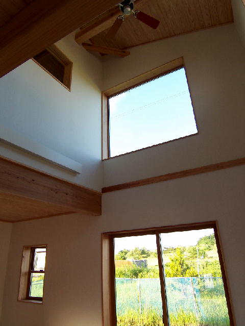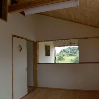 さらにこちらのお家、非常に眺めがいいんです。 そこでお施主さんは「吹き抜けの窓から自然の広がりを見渡せるように」と大きなピクチャーウインドウをつけることにしました。リビングの床は燻煙乾燥の杉無垢材です。壁はパーフェクトウォールお施主さん施工です。