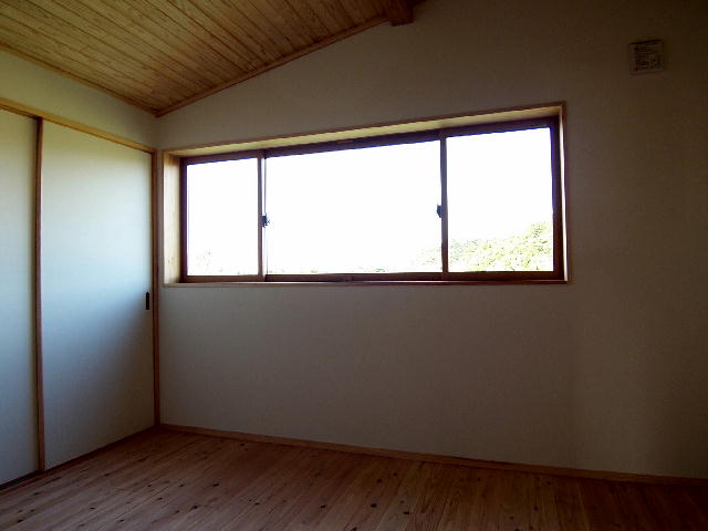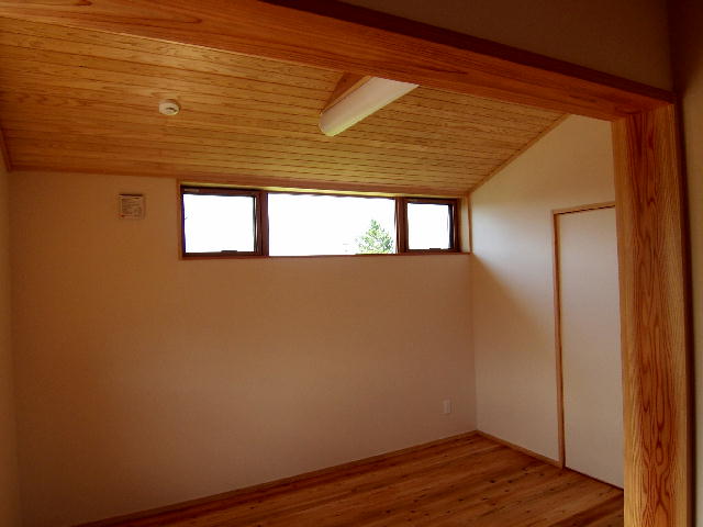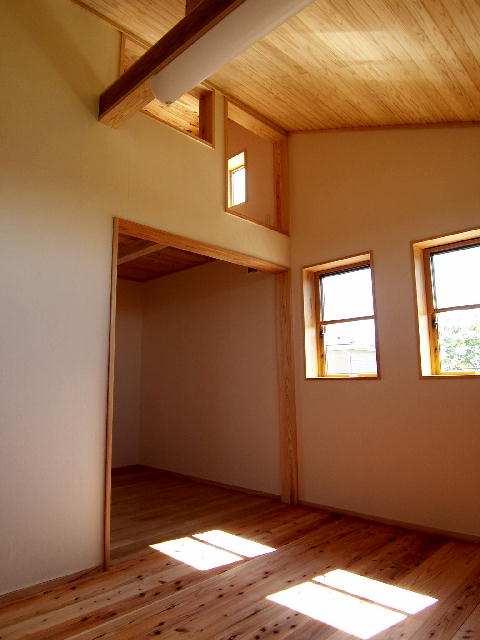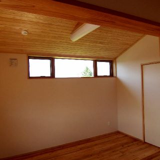 洋室1です。空間を少しでも有効に使いたいと、ロフトを設けました。このロフトは他の洋室ともつながっています。また、隣家の視線を気にせずに景色や風通しを楽しみたいと、連窓を高めに設置しました。この辺りの窓の種類や設置場所にもかなりこだわりを垣間見ることができます。