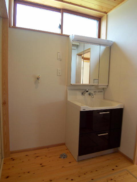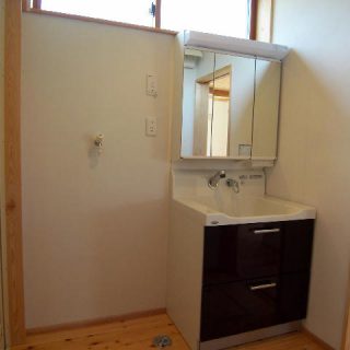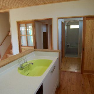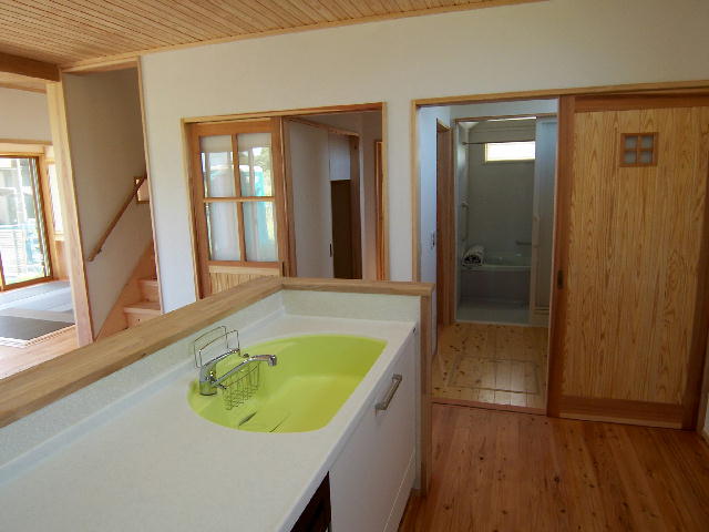 水回りです。キッチンは奥様お気に入りのYAMAHA(現在トクラス)製。カワイイ色や形状を評価されたのか、人造大理石の質を評価されたのかは分かりませんが、とてもよい雰囲気です。台所に隣接して洗面脱衣室を配置し、家事動線を楽にしています