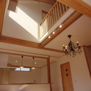リビングと吹抜。高窓から光が差し込むのでとても明るい!リビングの吹抜一階と二階をつなげます。床は無垢のヒノキ、壁は高性能珪藻土の「はいから小町」を使用しています。ロートアイアンでできたシャンデリアは奥様のお気に入り。