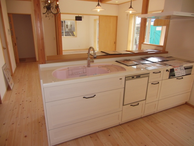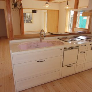 キッチンです。白い木調でアイアンの引き手、ピンク色のシンクを採用。木調キッチンに特徴があるウッドワン製です。対面キッチンの場合、コンロ前は壁になることが多いですが今回はフルオープン。側面の壁から白いスタイリッシュなデザインのレンジフードを設置しています。
