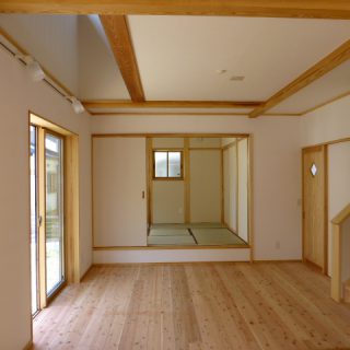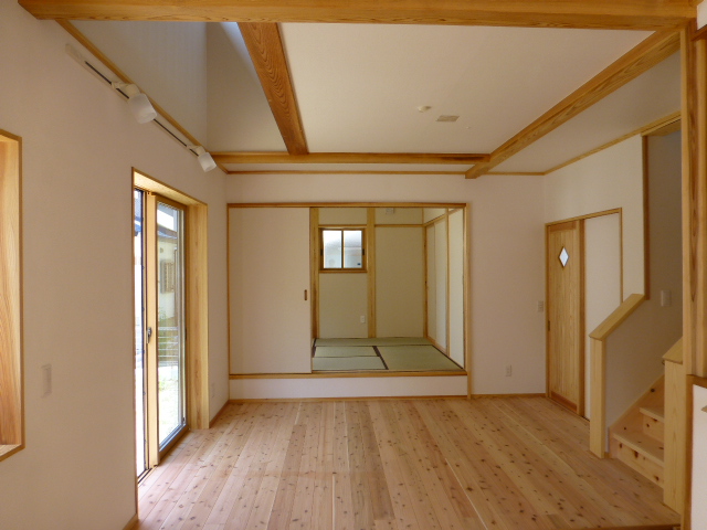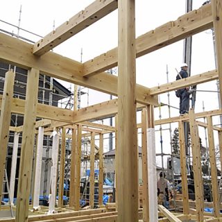 上棟 杉、檜を中心とした木材(全て無垢)で骨組みを組み上げました。木の香りがたっぷりです。 長期優良住宅の補助金をいただく要件ともなっていたので、構造見学会も行いました。後から聞いた話ですが、こちらのお家、工事中に近所で工事している職人さん達の間で話題になっていたそうです。 大工さん達も見学に来たとか・・・。