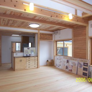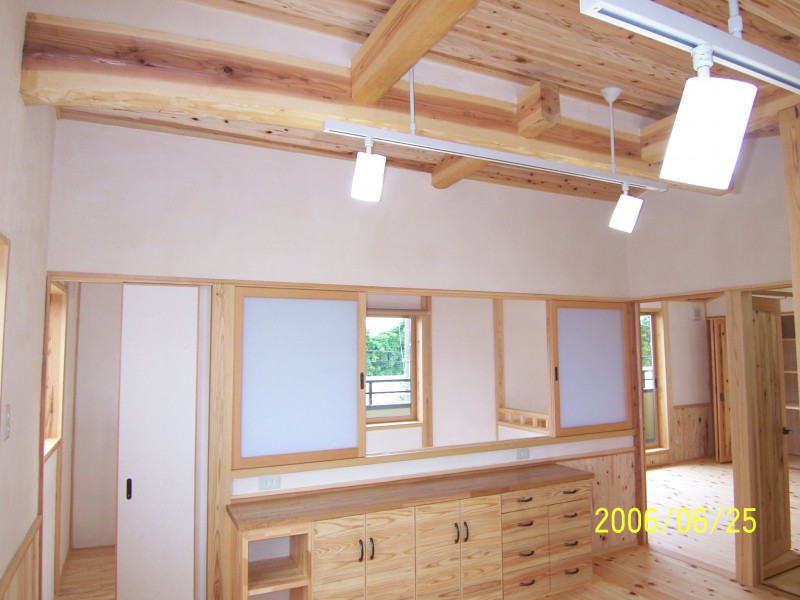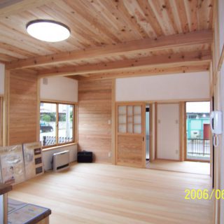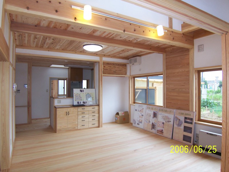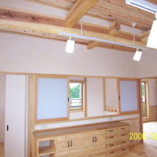リビングの写真です。柱と梁は国産の杉材です。床は無垢の桧を使用しています。通常は一等材といって節がある素材を使うのですが、今回は「節は少なくしたい」というご要望から上小節を採用しました。壁は珪藻土「はいからさん」、天井は秋田杉を貼っています。造り付けの収納も良い感じにできあがりました。
