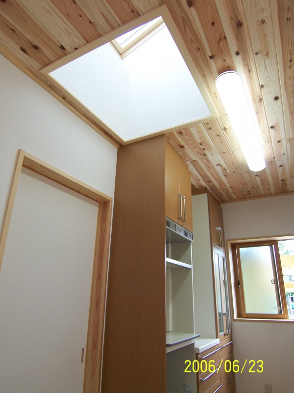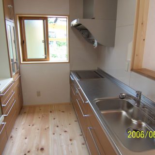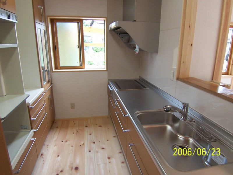 台所の様子です。 今回は対面キッチンとしています。さほど大きくないスペースに収納がしっかりととられています。(お施主さんが、収納するものの寸法をしっかりと測ってお選びになりました)今回はIHクッキングヒーターをご採用。この部分の床も桧ですが、こちらは節ありの一等材を使用しました。
