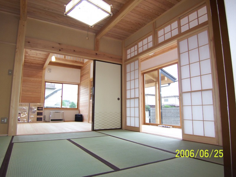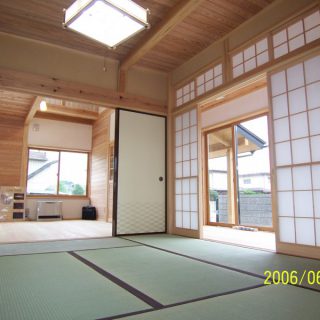 リビングからつながる和室です。襖の開け閉めによって連続して使うことも、個室として使うことも可能です。 畳は宮城県産100%のわら床(1年以上自然乾燥)、熊本産の減農薬イグサ(着色剤不使用、天然泥染め)を使用しています。壁はレーベンという和紙を使った素材です。