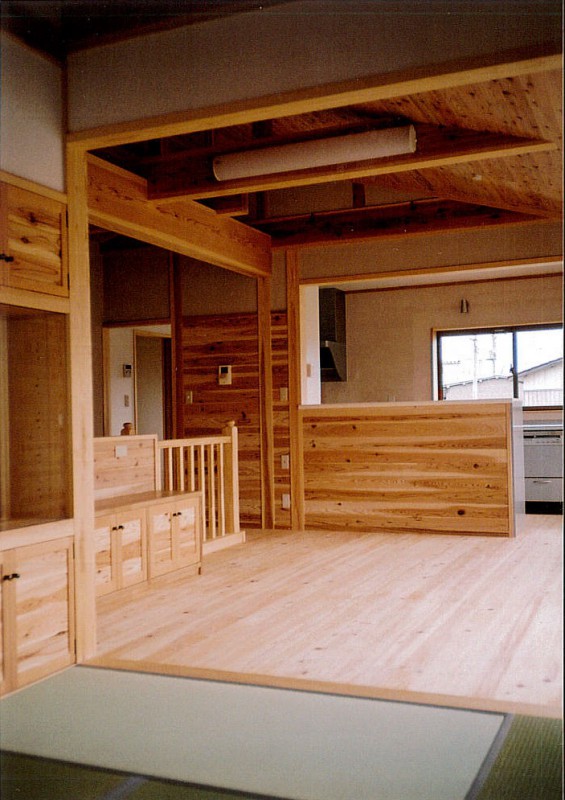 明るい二階キッチンで、年々色づく杉の化粧梁を眺めながら、