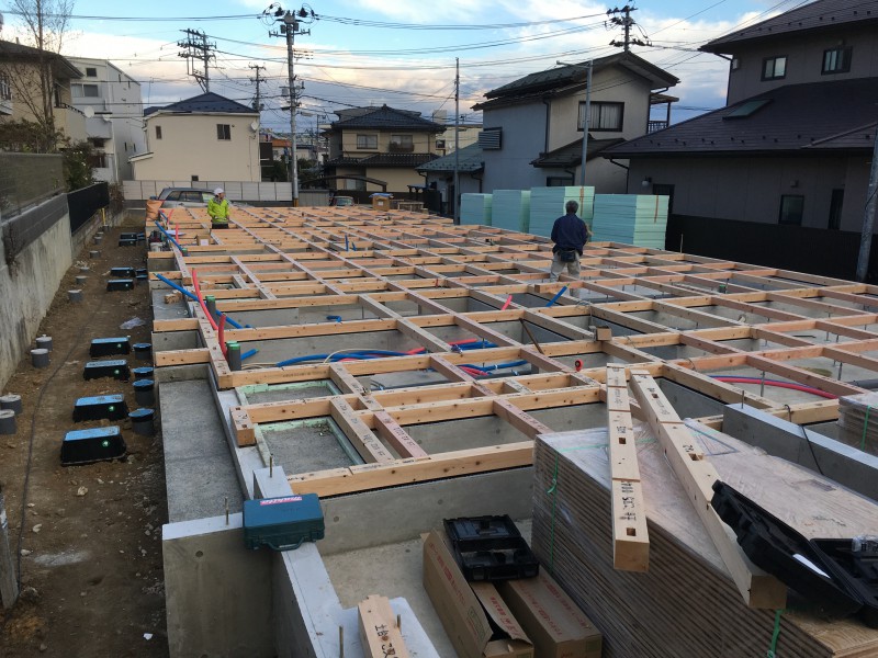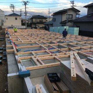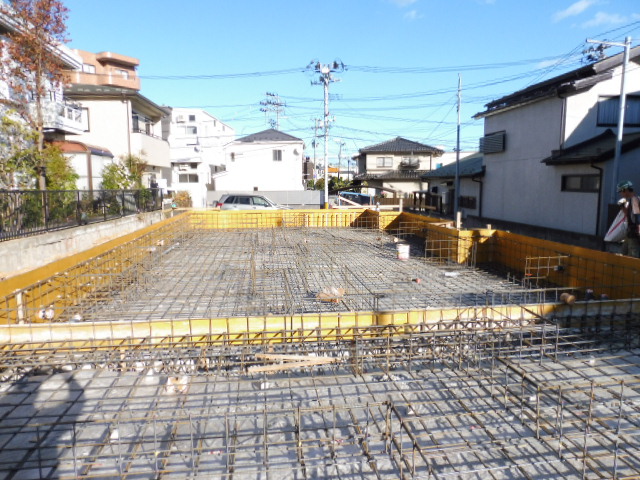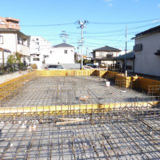 基礎の鉄筋を組んだ状態です。敷地内の高低差に合わせて基礎の底盤を一段下げて施工しています。基礎の掘削時に、仙台市の文化財課の立ち会いがありました。文化財が出てくる可能性がある地域として指定されているのです。