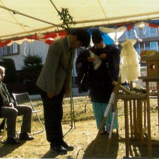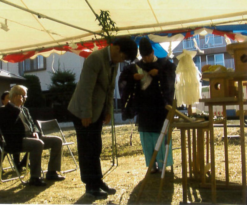 地鎮祭の様子です。設計者はアパートを数多く手がける不動産業者OBで経験豊富な方です。最初にお話をいただいたのはお盆前。図面はほぼできあがっていたのですが見積から契約、着工まで1ヶ月半という慌ただしさでした。