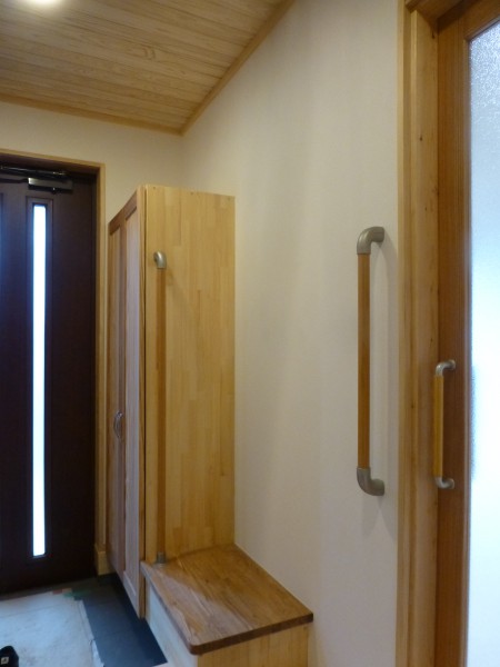 「母の介護のため、時間がとれなく、現場を見に行くことはほとんどできないと思いますが、よろしくお願いします」と仰り、細かい注文はあまりないお施主さんでしたが、こだわられたのは以下のような点でした。●腰をかけて靴を脱いだり、一休みできる手すり付ベンチの設置。