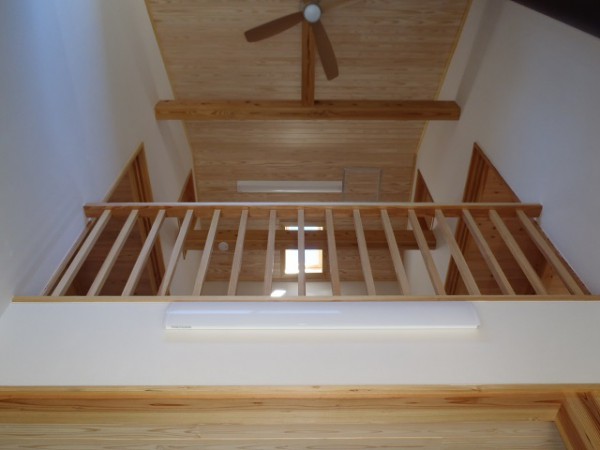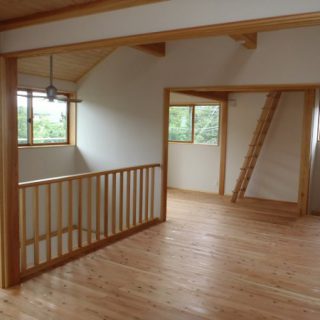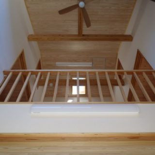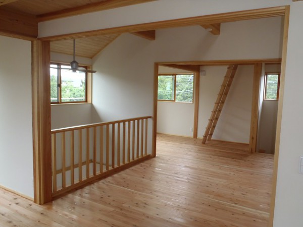 2階ホール。1階2階とも、ほぼワンルーム的な間取りです。 耐震上、必要な壁は残しつつ、他は建具で間仕切りできるようにしています。 お家自体はコンパクトなので、 広めにロフトを設置し、 空間を確保しています。