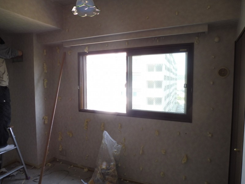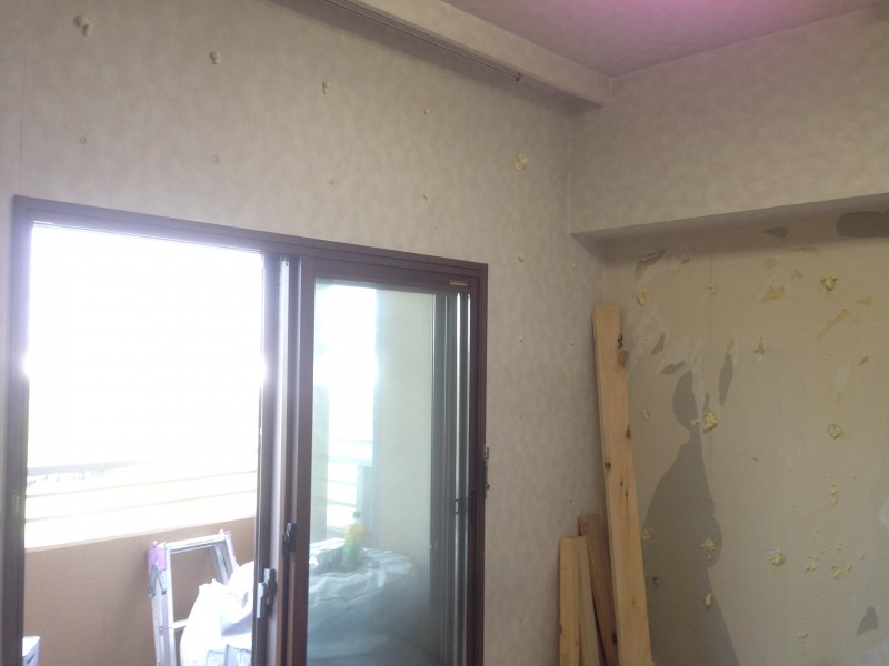 廊下と一体化する「洋室2」です。壁から泡のように出て見えるのが発泡ウレタン。この状態では内部にしっかりと充填できているか今ひとつ確認できませんが、断熱の改善は図れるだろうという判断をお客様とともに下しました。