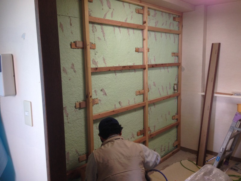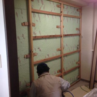 外部に面した内壁の中を断熱強化することも実施しました。本来なら壁下地の石膏ボードを撤去して断熱材を入れ直すことが最善なのですが、今回は簡易的に壁の中にある空間(20~30mm程度と思われます)に、現場発泡のウレタンフォームを注入する方法をとりました。