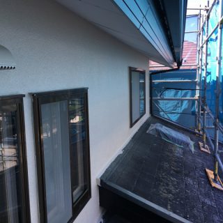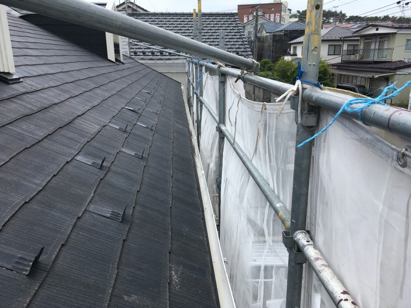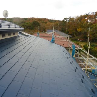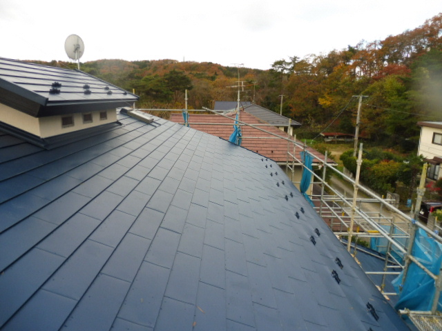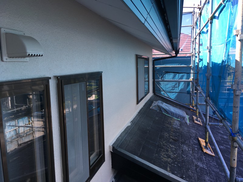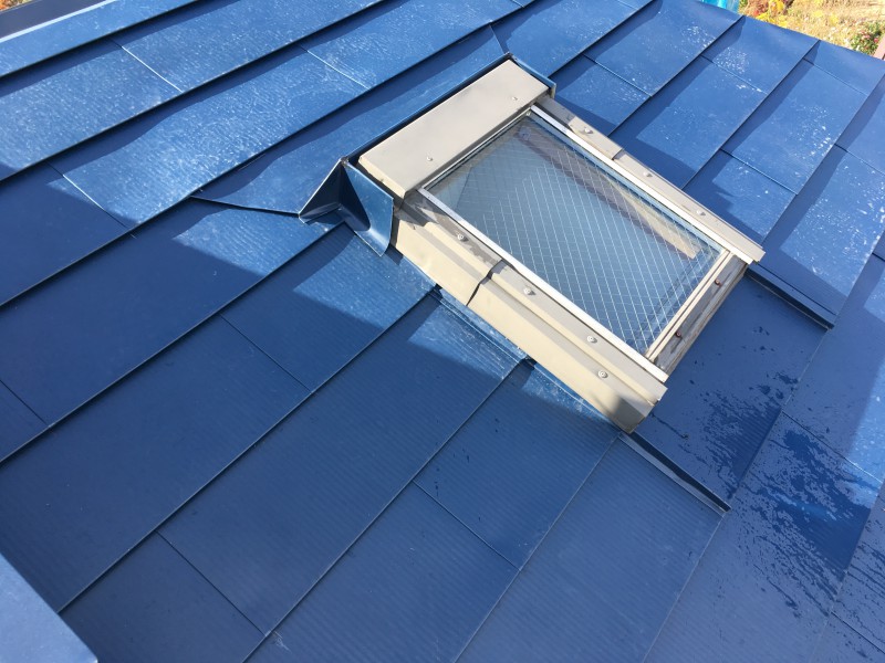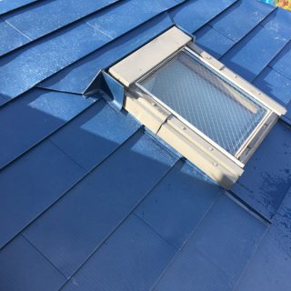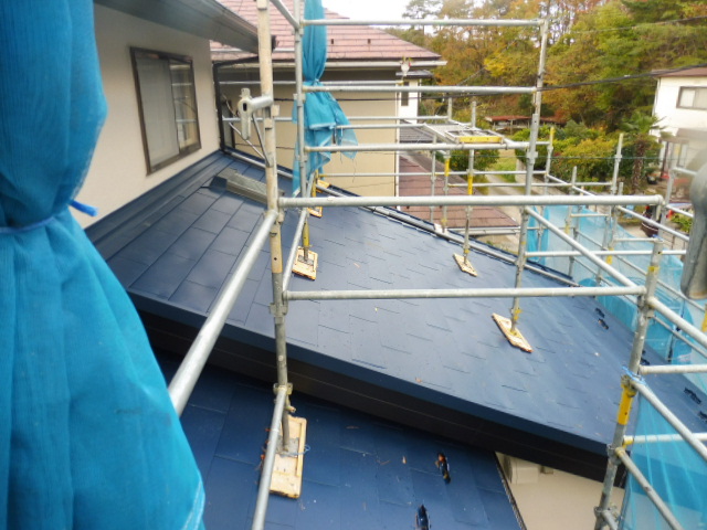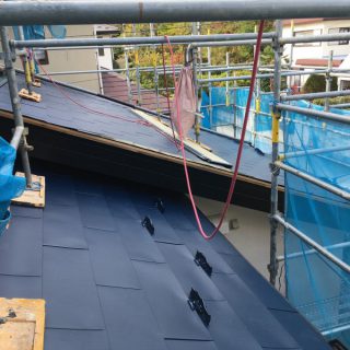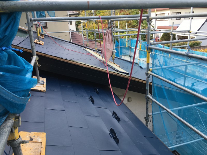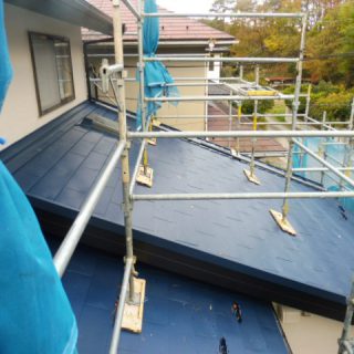 塗装終了後、屋根の葺き替えです。葺き替えと言っても現在の屋根材は撤去せず上からかぶせていく工法「カバールーフ工事」です。工事中の雨を気にせず行えますし廃棄物を出さないので費用的にもメリットがあります。