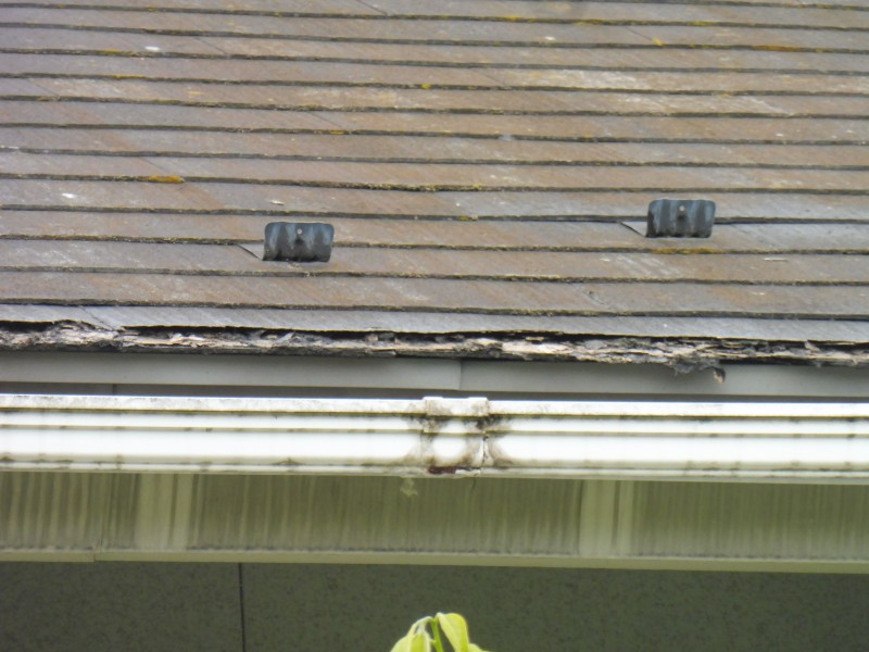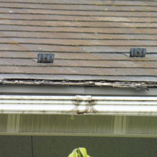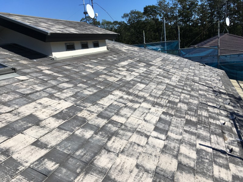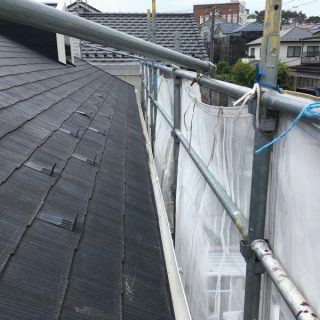 JR仙山線国見駅から徒歩圏内の立地です。しかしながら周囲は「森」と呼べるような緑の多い環境。冬になると落ち葉が飛んでくるそうです。工事中に足場を掛けたのですが、「せっかくだから雨樋の落ち葉を掃除して~」とお願いされてしまいました。下から見ただけでも、屋根材のコロニアルの傷みが分かります。このくらい劣化が進んでしまうと塗装では対応できません。今回はコロニアル屋根の上から板金屋根をかぶせる「カバー工法」をご提案しました。