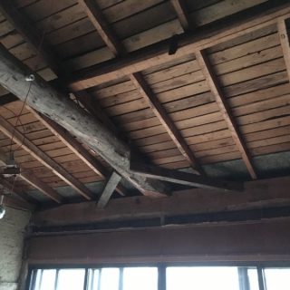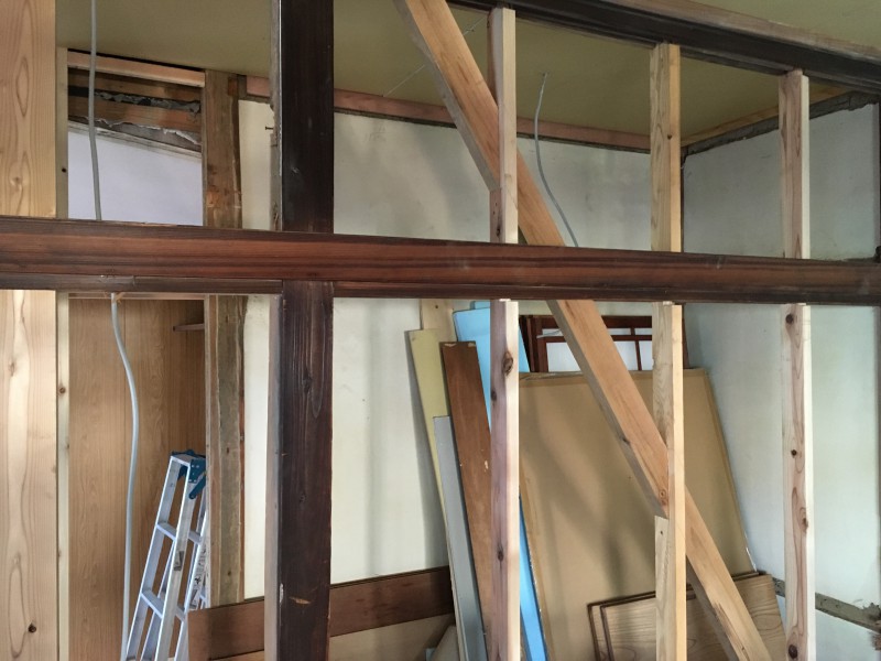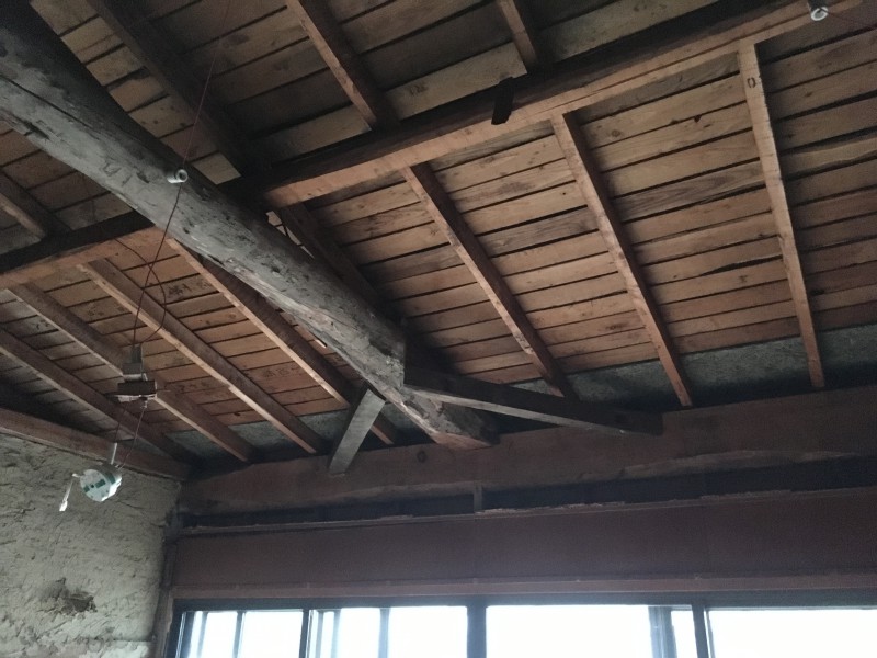 天井を解体しました。屋根の下に出てきたのは丸太の梁材。現場をご覧になって「せっかくだからこれが見えるように天井を作りたい」と。平らに天井をあげる予定でしたが、この部分だけ斜めの天井(勾配天井)にしました。