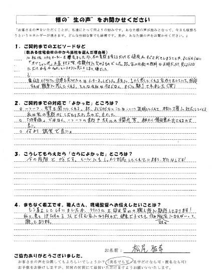 ○一つ一つ、要望を聞いてくれる。また、よく分からないところは一つ一つ説明してくれて、本当に丁寧に対応してくれる。