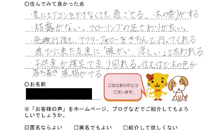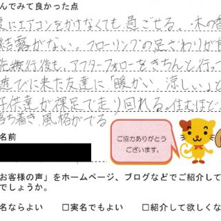 素晴らしい家を建てて頂きありがとうございました。住んで十日が経ちましたが、妻と子供達の笑顔が増えました。帰ってくると、木の匂いが立ちこめ、優しい気持ちになれますし、娘や友達達は、裸足で駆け回っています。