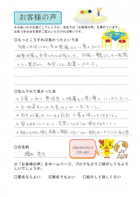 実際に生活してみて冬が予想以上に寒かったので断熱対策を充実させればよかった。